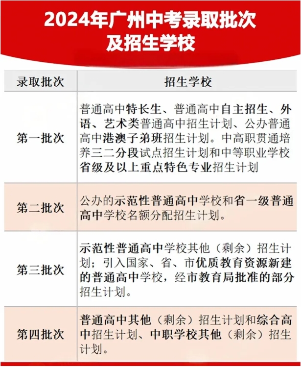 1、2024年广州中考共4个招生录取批次,按上图的从上到下的先后顺序录取,每天二个批次,第一批先录取,第一批录取结束后才进入第二批录取,逐个下推。